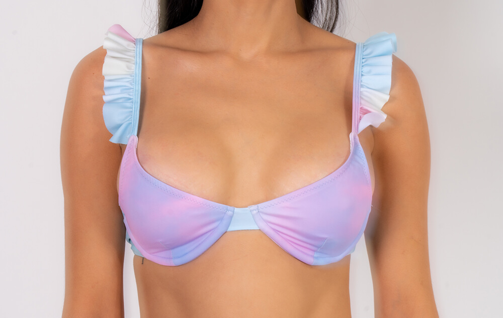 El encantador Luna Tie Dye Bikini es un imprescindible. Este adorable diseño incluye un top estilo bralette con volantes decorativos y está adornado con nuestro exclusivo cierre con baño de oro rosa. Sus tirantes ajustables aseguran un ajuste perfecto. La parte inferior de cobertura media con diseño fruncido está diseñada para realzar tus curvas.