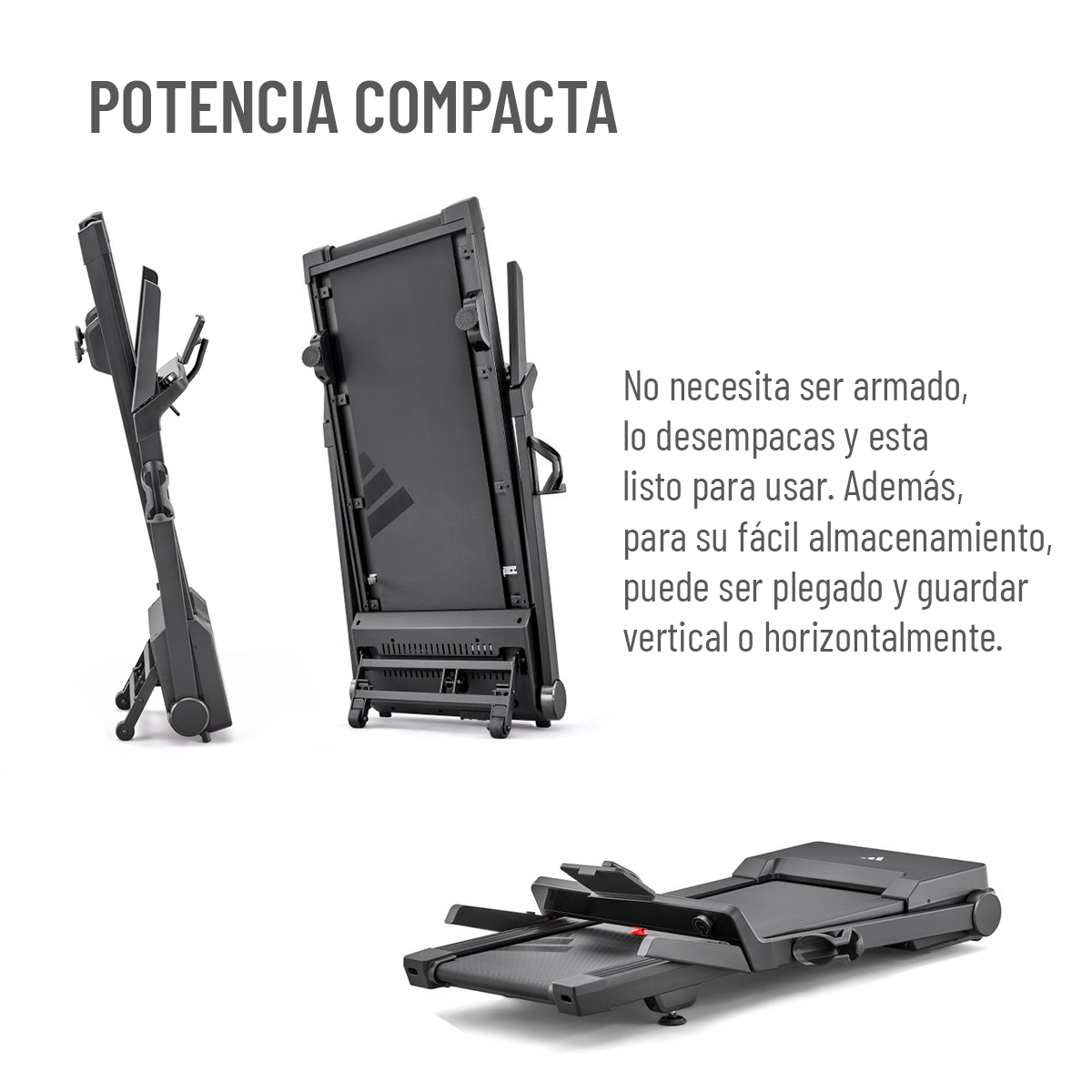 Diseño ultra-compacto y plegable, fácil de almacenar de pie o en posición plana, adaptándose perfectamente a cualquier espacio sin herramientas ni ensamblaje. Solo desembala, despliega y empieza a entrenar.