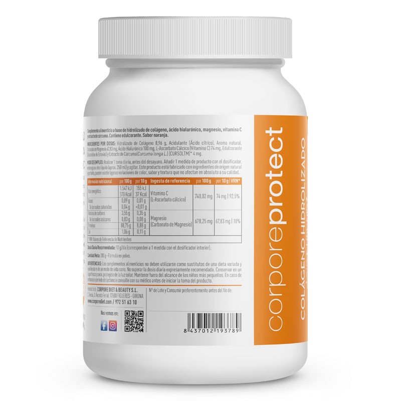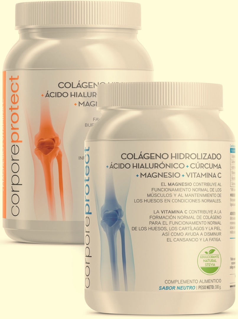 La fórmula de Corpore Protect es la única en el mercado que ha sido complementada con Cúrcuma, Magnesio y Vitamina C para mejorar la absorción del colágeno y potenciar así sus propiedades regeneradoras.