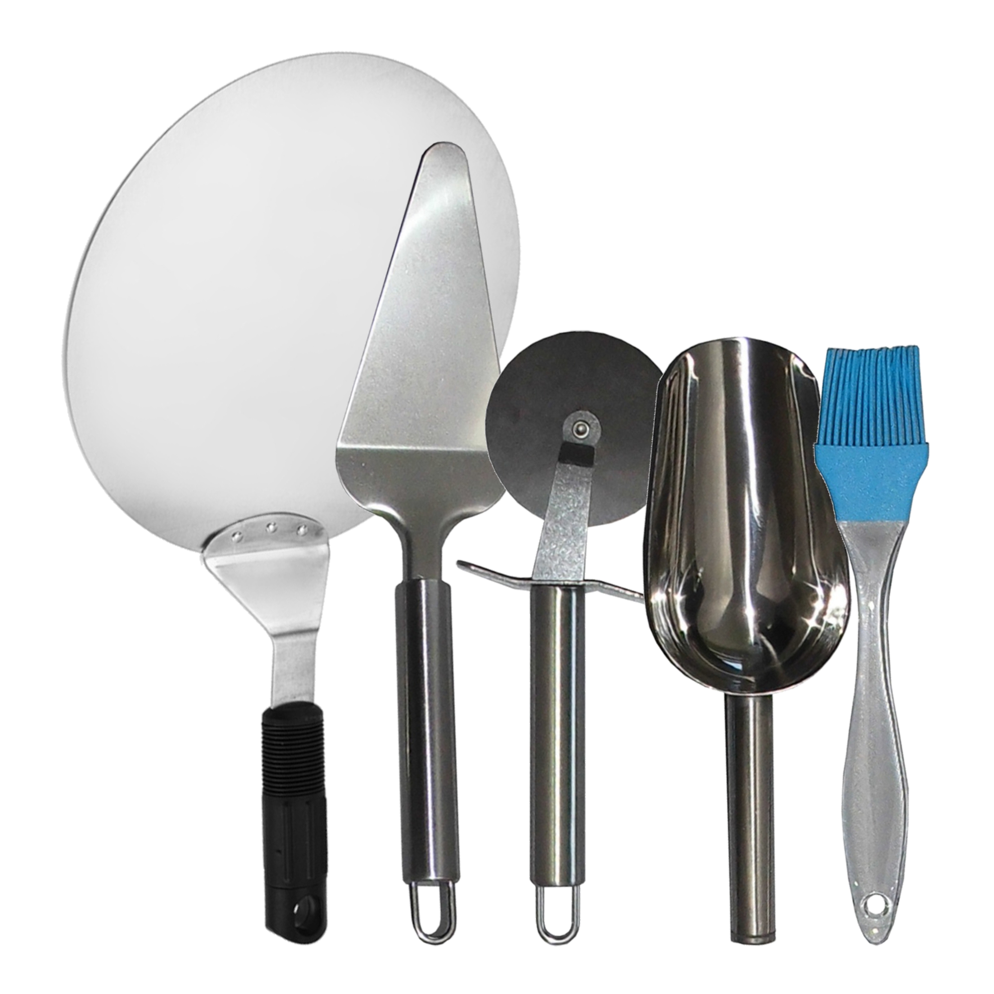INCLUYE: Pala para Pizza x 1, Pala para Pastel x 1, Cortador de Pizza x1, Paleta para Pellets x 1, Pincel de Horno x 1.