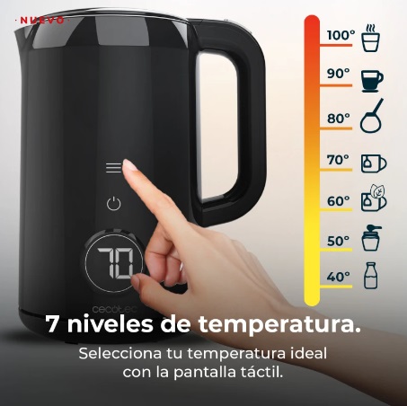 · Pantalla táctil con 7 niveles de temperatura: 40ºC (leche), 50ºC-60ºC (tés blancos y herbales), 70ºC (té verde), 80ºC (té o mate), 90ºC (café), 100ºC (hervir). Además, el hervidor cuenta con una luz led con diferentes tonalidades para poder controlar la temperatura del agua en tiempo real.