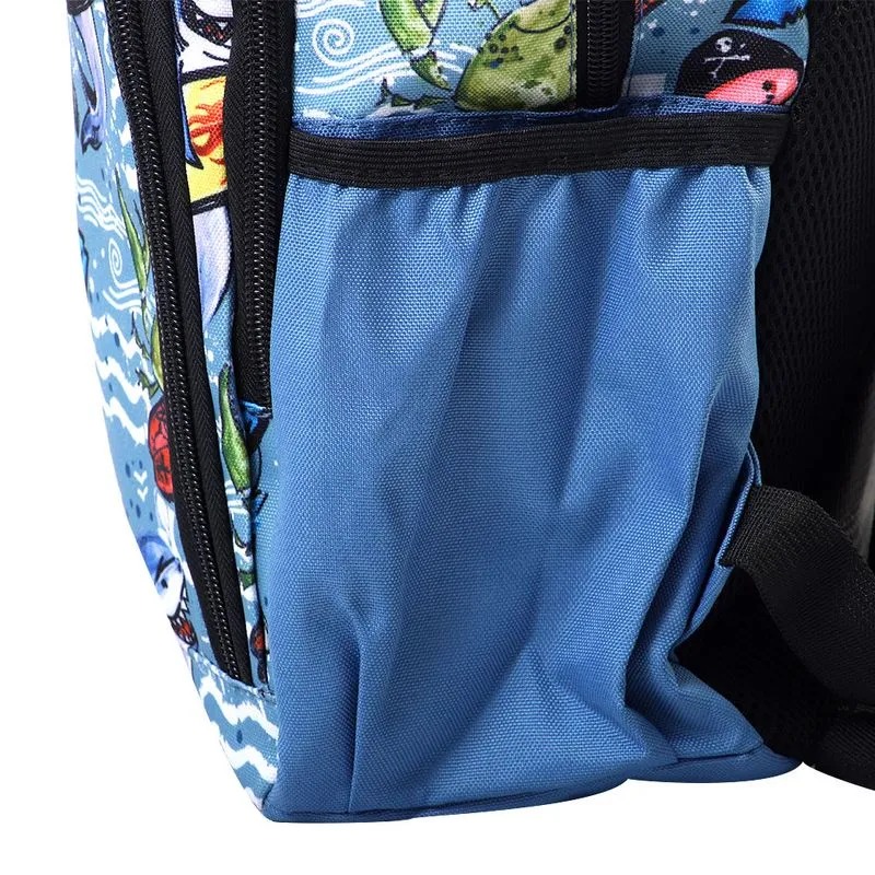 Lleva todos tus útiles escolares con estilo con esta mochila de diseño colorido y estampado animado de criaturas del fondo del mar, soporte de tirantes ergonómicos y asa superior para transporte manual.