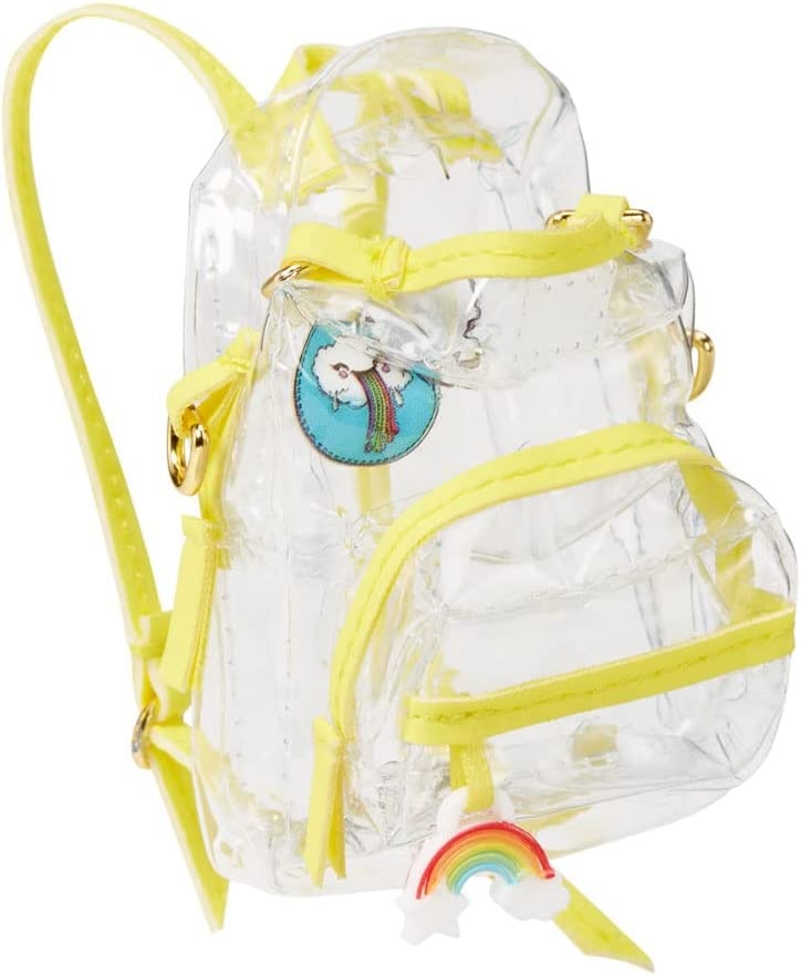Viene con una mochila de vinilo de tela suave que se abre y cierra con dijes de arco iris y gráficos impresos.