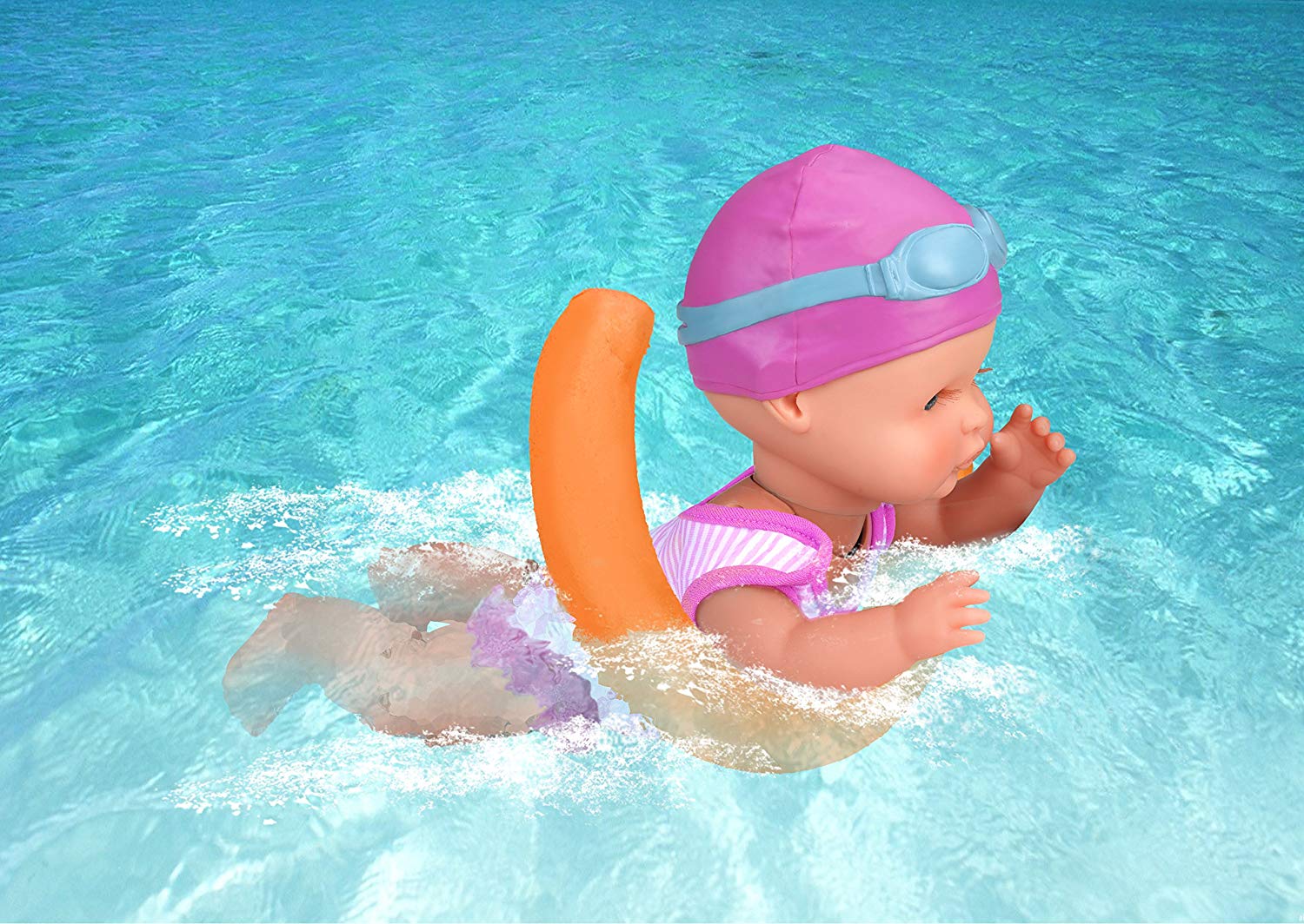 - Incluye un divertido traje de baño, gorrito y gafas de natación incorporadas en el muñeco.