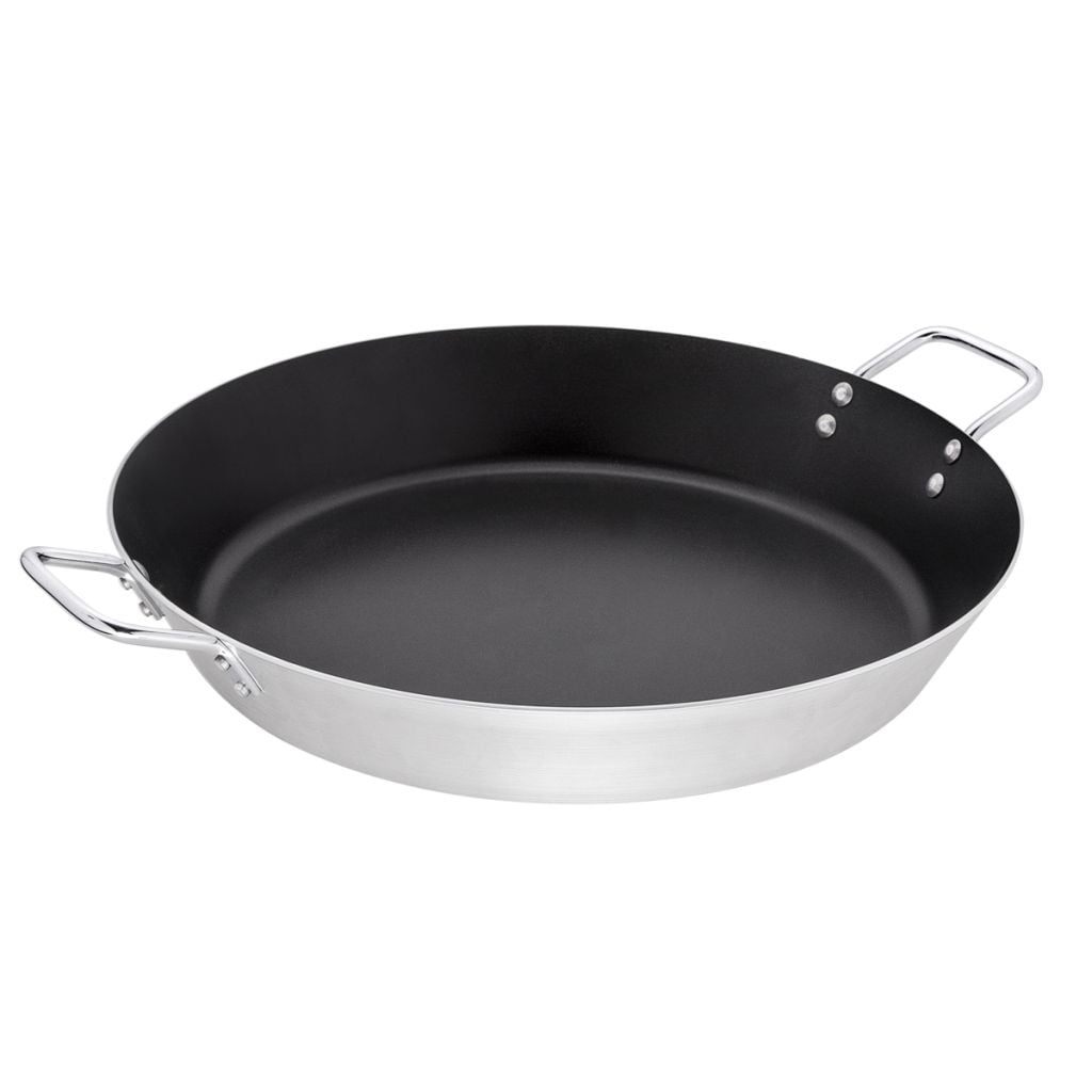 placentera con la paellera Tramontina profesional de aluminio, con terminación externa lijada con revestimiento interno antiadherente Starflon T3 y asas 45 cm de diámetro, 9,2 l. Ella le permite los más diferentes tipos de preparaciones, como paella y risottos. Fabricada en aluminio con terminación externa lijada le traerá durabilidad a su cocina, además de un diseño bellísimo. Su revestimiento interno de antiadherente Starflon T3 cuenta con más poder de anti adherencia, más resistencia a la abrasión, más durabilidad, más facilidad de limpieza y es exento de PFOA. Para hacer el manejo más práctico, cuenta con asas de acero inoxidable remachadas. Deje que la creatividad lo invada con la línea de sartenes profesionales de Tramontina y realice increíbles recetas con ella.