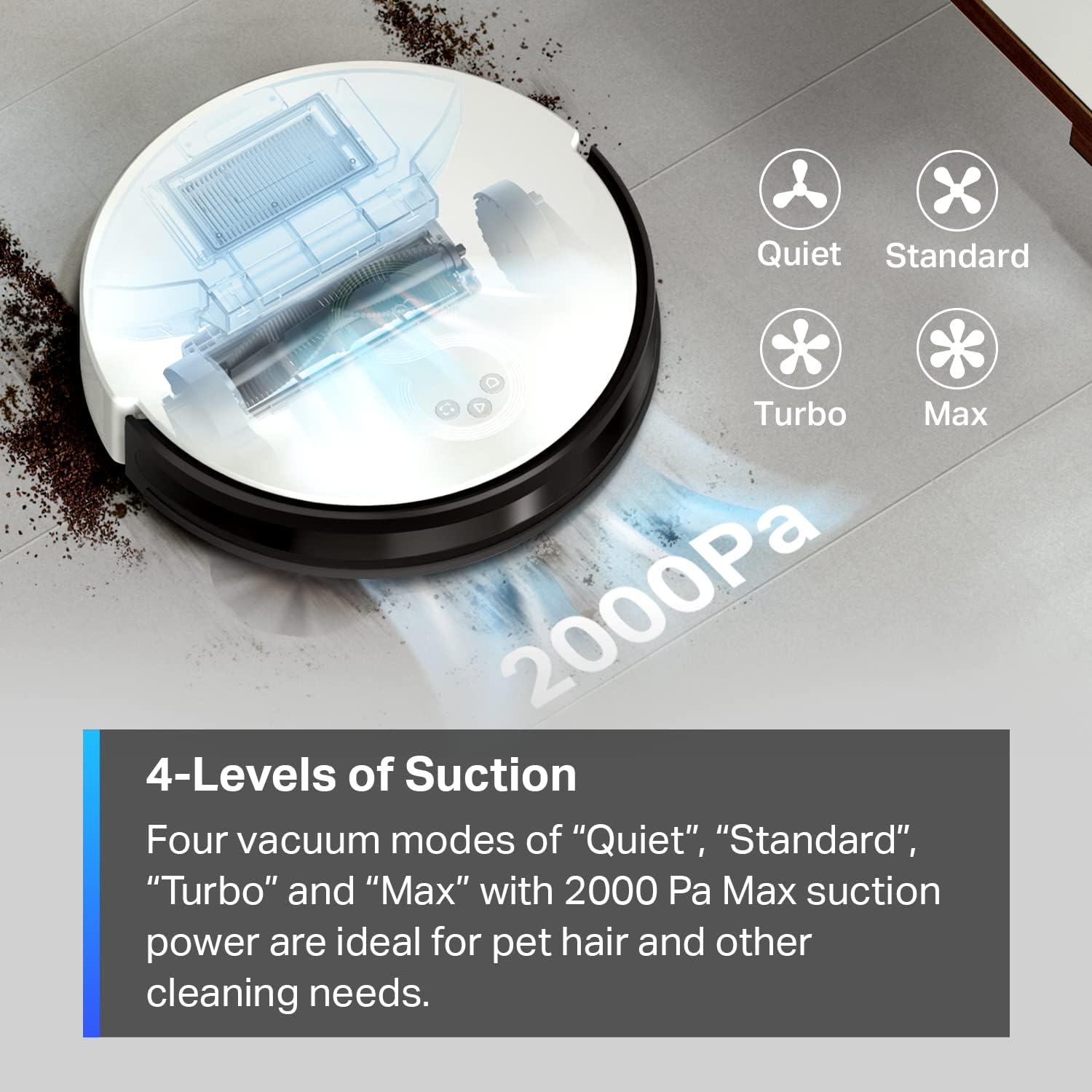 Modos de succión de 4 niveles: succión fuerte de hasta 2000 Pa, limpia fácilmente el pelo de las mascotas, la suciedad diaria y los desechos pesados. Limpieza silenciosa con niveles de ruido más bajos, hasta 53 dB mientras está en uso, más silencioso que un microondas en funcionamiento