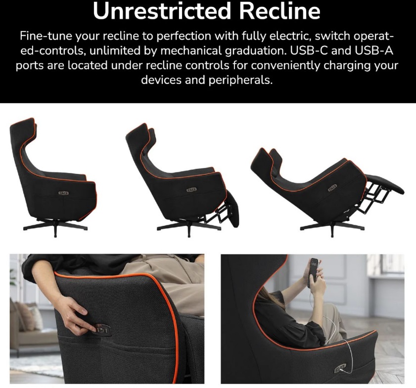 Ajuste su reclinación a la perfección con controles totalmente eléctricos operados a través del interruptor, sin límite de graduación mecánica. Los puertos USB-C y USB-A están situados debajo de los controles de reclinación para cargar sus dispositivos y periféricos cómodamente.